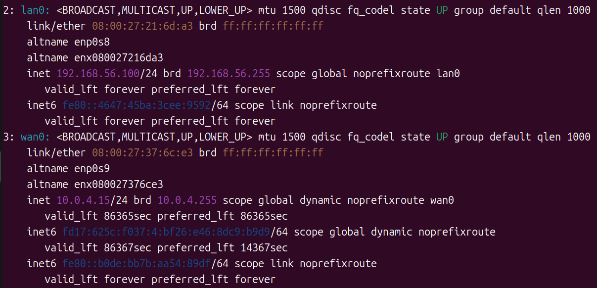sudo reboot重启后再次执行ip addr,确认网卡名已变为wan0和lan0。